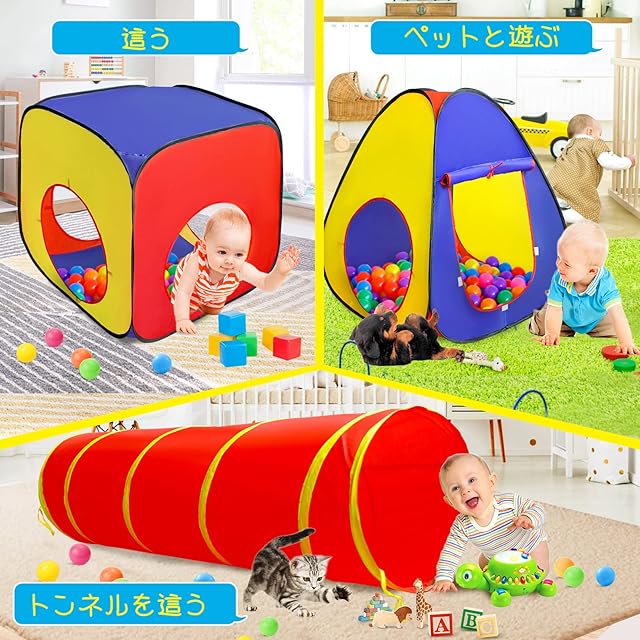 【完璧な子供プレゼント】本製品はボールハウス、四角いテント、トンネルの三つの部分に構成されています。各テントを組み合わせて使えますが、別々に使用してもOKで、いろいろな使い方があります。友達と遊びに行きましょう!お祝いやプレゼントとして他人に贈るのに適しています。