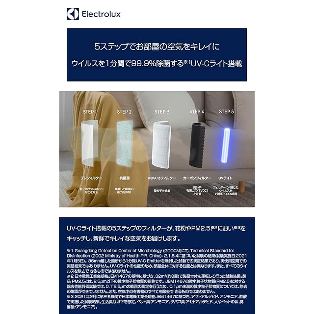 【高速除菌】ウイルスを1分間で99.9%除菌*²するUV-Cライトを搭載。5ステップで花粉やPM2.5*³、におい*⁴をキャッチ。細菌*⁵、カビ*⁵、ウイルスを99%*⁶除去。