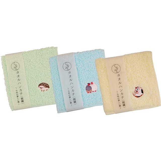 今治で織った、くるまる優しさ「くるみん」。 丁寧で繊細な刺繍。優しい肌触りのやわらかくてふわふわ心地よいタオルハンカチの3枚セットです。 綿100%、安心の国産、今治製です。使いやすいサイズ感で吸水性に優れ、お子様にもおすすめ。男性の方にも好評です。 海外の方にも人気の柄をセットにしました。
