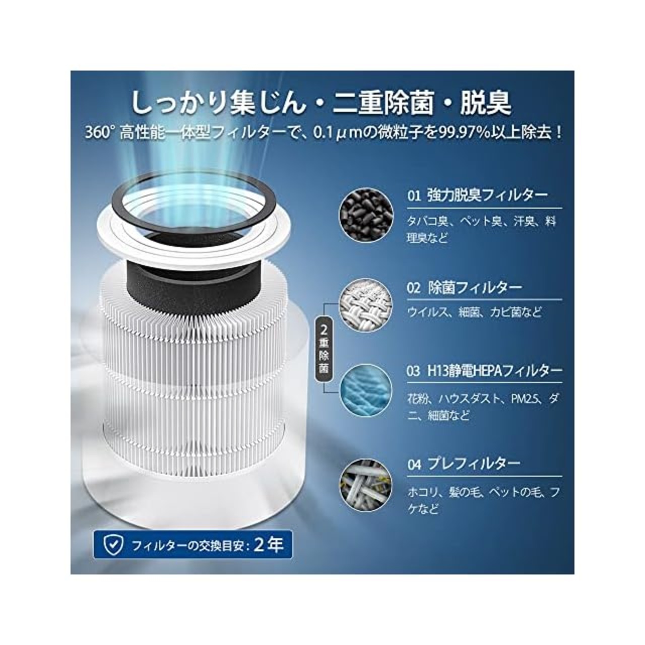【4層清浄と二重除菌、20畳まで対応】4層の高性能hepaフィルターで、お部屋の中で99.97%の花粉・ホコリ・タバコの煙・細菌・アレルゲン・PM2.5・ペットの臭い・カビ臭・ハウスダスト・抜け毛などを取り除き、2花粉症、アレルギー、喘息、ウイルス、喉の痛み、くしゃみ、皮膚の痒みなどの悩みを簡単に対処できます。