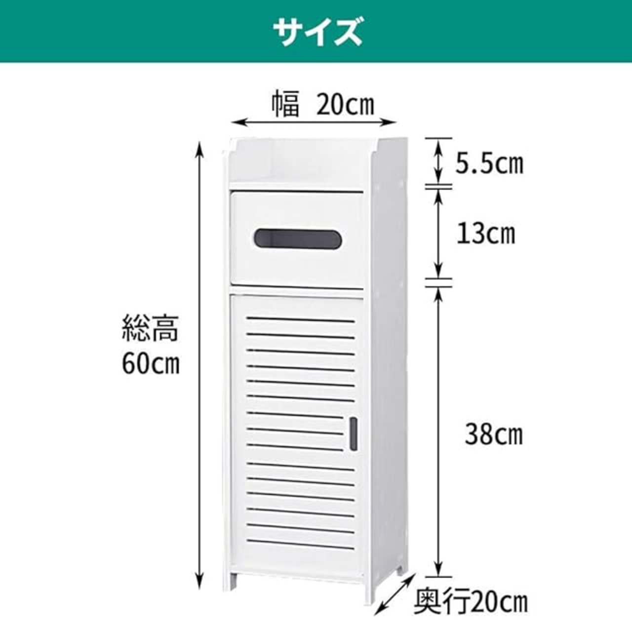 シンプルな真っ白のデザインで限られた空間を圧迫しない、幅20㎝とスリムな『トイレ収納ラック』 お掃除用品やサニタリー用品などをスッキリ隠して収納できます。 パーツの板をそれぞれの穴に差し込み、扉の開く向きを決めて付属のネジで固定すれば組み立て完了。女性でも簡単に組み立てができる収納棚です。 【限られた空間に収納スペースを】 中段の引き戸扉になっている棚には、ペーパータオルなどが取り出しやすい窓が付いており、使い方によってはサニタリー用品も収納することもできます。 下段の棚にはトイレブラシや洗剤などのお掃除用品を隠して収納し、スッキリ見せることができます。 【清潔に使える木製プラスチック素材】 防水・防カビに優れている木製プラスチック素材なので、湿気の多い場所の収納に適しています。 汚れたり水に濡れてしまったときには、サッと拭き取り清潔に使えるので、トイレだけでなく、リビングや玄関、キッチン収納にも使い頂けます。 また、耐火性にも強いため、万が一の場合が起きても、黒く焦げて鎮火するため燃え広がる心配が少ない素材となります。 【穴あけ不要で組立簡単】 表・裏の指定が無いため、使う場所や利き手に合わせて扉の向きを変更可能。 扉の開く向きを決め、パーツの板をそれぞれの穴に差し込み、付属のネジを使って固定すれば出来上がり。 穴あけが必要なく、女性でも簡単に組み立てることが出来ます。 【商品詳細】 サイズ(約):全高/60×20×20cm 中段内径/高さ10.5×横18×奥行17cm 下段内径/高さ36×横17×奥行17cm