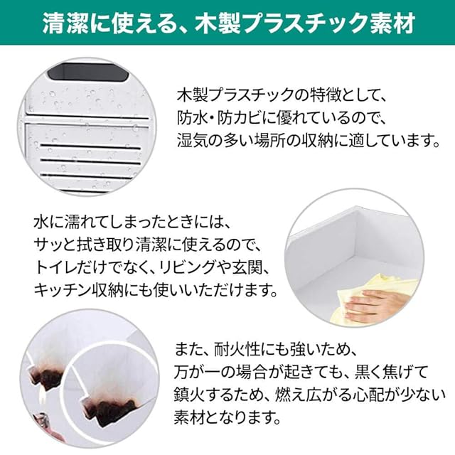 防水・防カビに優れている木製プラスチック素材を採用しており、湿気の多い場所の収納棚として適しています。汚れたり水に濡れてしまったときにも、サッと拭き取り清潔に使えるので、トイレだけでなく、リビングや玄関、キッチン収納としてもお使い頂けます。また、耐火性にも強いため、万が一の場合が起きても、黒く焦げて鎮火するため燃え広がる心配が少ない素材です。