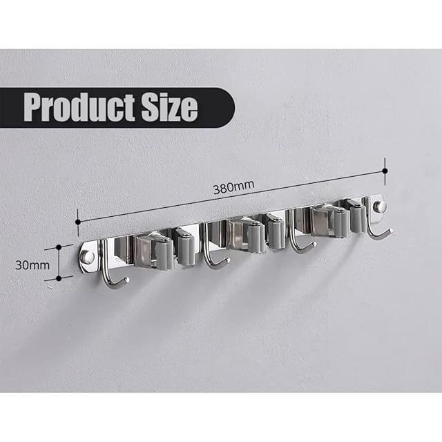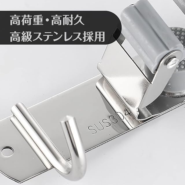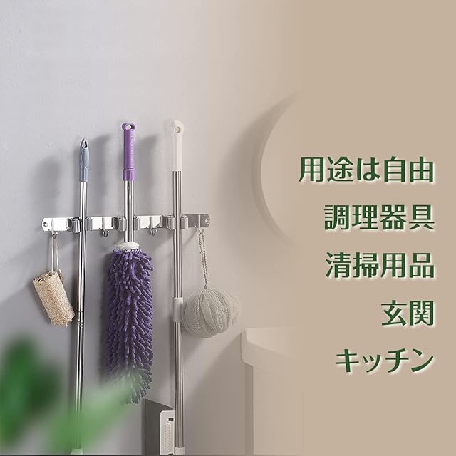 【このモップホルダーの特徴】モップホルダーはスムーズな高級ローラーを使用し清掃器具などの脱着がスムーズに行えます。フックは高荷重にも耐えられる高級ステンレスフックを採用。使ってみれば違いわかるモップハンガー。【使い勝手の良い仕様の壁掛けハンガー】ほうきやモップ、水切りワイパー、調理具、清掃用品など安定固定できる優れもの。玄関やキッチンなど、場所を選ばずおしゃれなデザイン【安定した土台のモップハンガー】ネジ又は、両面テープ 壁掛け、ねじ取付、テープ取付方法が可能 ねじ取付は重量物にも耐えられます。【サイズ、素材】丈夫で長持ちステンレス製 フック4か所、ホルダー4か所、サイズは長さ38cm・幅約3cm【おしゃれでシンプル・狭い場所にもOK】モップハンガーは、スペースの狭い箇所にも設置可能。幅38cm、幅3cm細長い設計ですのでお風呂、洗面所、キッチンなど空いたスペースを有効に活用できます。