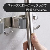 【このモップホルダーの特徴】モップホルダーはスムーズな高級ローラーを使用し清掃器具などの脱着がスムーズに行えます。フックは高荷重にも耐えられる高級ステンレスフックを採用。使ってみれば違いわかるモップハンガー。