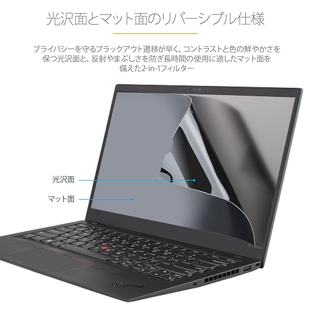 リバーシブルセキュリティフィルター: 映り込みが気になる環境に適したアンチグレア(反射防止/無光沢)と、色の鮮やかさを保つことができるハイグロス(光沢)の両面使用が可能。マット面は、傷や指紋がつきにくいコーティングで高い保護効果