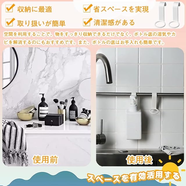 シャンプーボトルなどの吊り下げや整理整頓に。 スペースを利用してすっきりと収納できるだけでなく、ボトルの底の湿気やカビの解消も提案し、お手入れもしやすくなっています。シャンプーボトルなどの吊り下げシャンプーボトルなどの吊り下げや整理整頓に。 スペースを利用してすっきりと収納できるだけでなく、ボトルの底の湿気やカビの解消も提案し、お手入れもしやすくなっています。