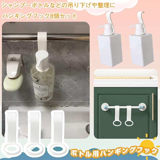 お風呂ラック 吊り下げ ボトルホルダーフック 8点セット シャンプーボトルフック 浴室 フックホルダー 省スペース 穴あけ不要 取り付け簡単 洗面所/お風呂/浴室収納 ディスペンサーボトル用 吊り下げ収納 ホワイト (口径約2.5cm/3.1cmの2種類)