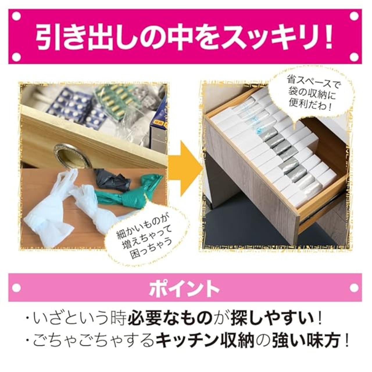 【かさばる袋をスッキリ収納】袋類をまとめて収納できるごみ袋用収納ケースになります。折りたたんで収納ができ、まとめにくいレジ袋などを省スペースにスッキリ収納することができます。