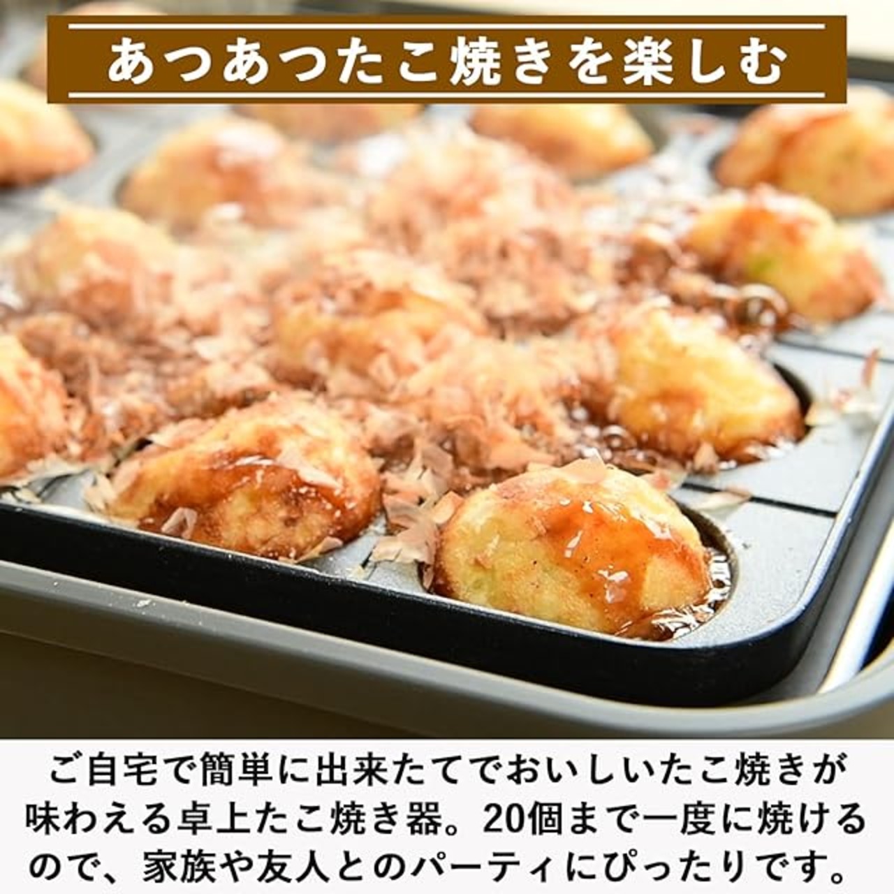【あつあつたこ焼きを楽しむ】ご自宅で簡単に出来たてでおいしいたこ焼きが味わえるたこ焼き器。卓上で使いやすいようにコンパクトサイズにリニューアルしました。一度に20個まで焼けるのでご家族やご友人とのホームパーティで活躍します。