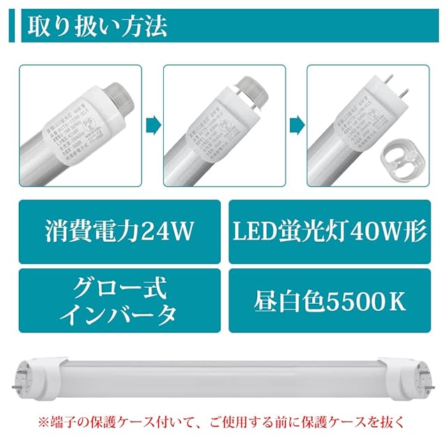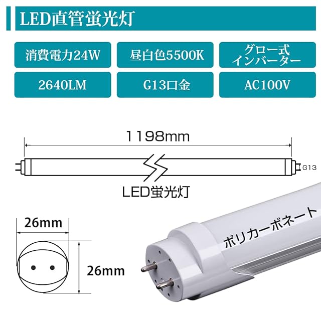「40w形LED直管蛍光灯-消費電力24W」電圧:AC100V 50/60Hz 40W形 口金:G13 T8 全光束 高輝度:2640LM ビーム角:320度 寸法:φ26 × L1198mm 色温度:昼白色 5500K 両側給電タイプLEDランプ。