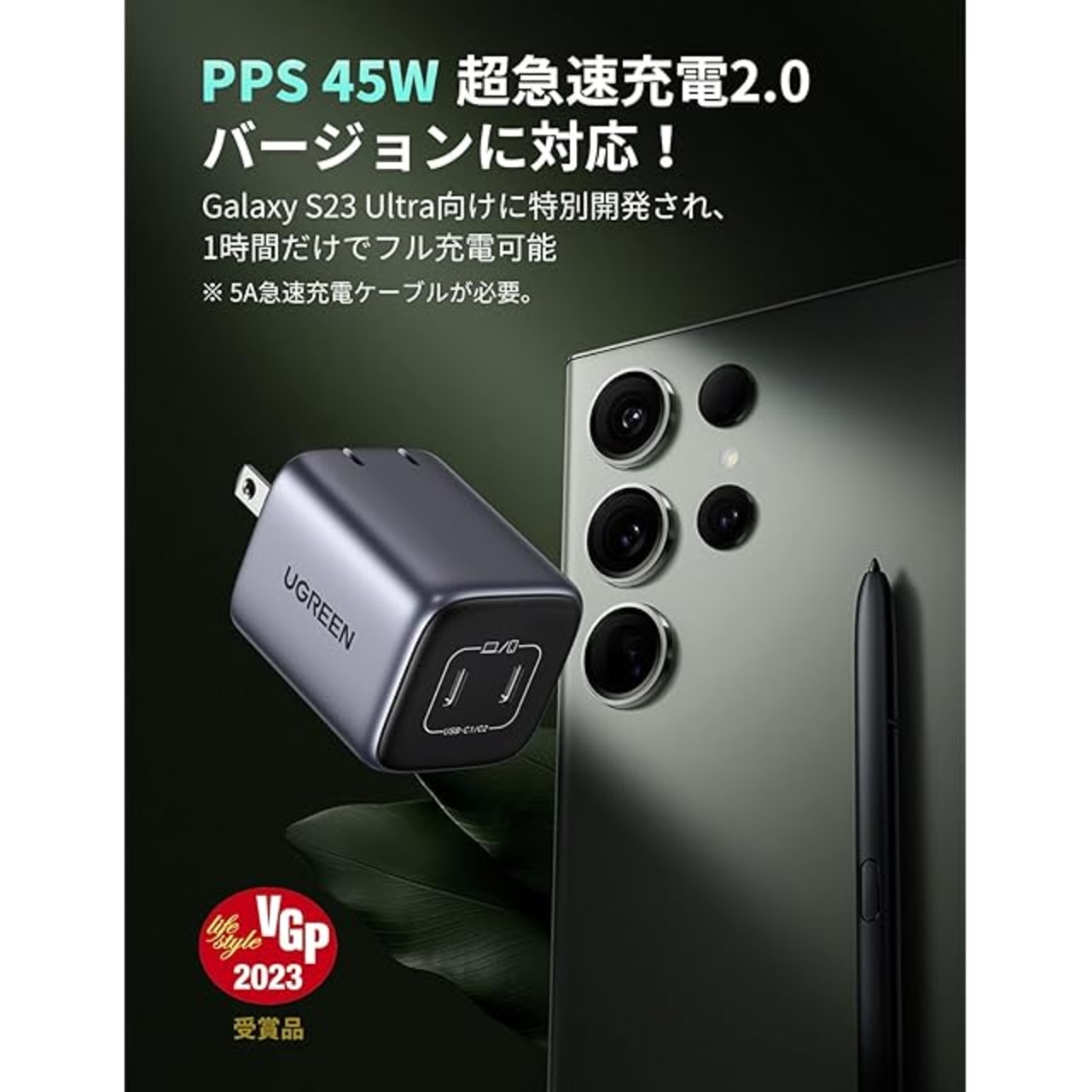 UGREEN Nexode Mini 45W 充電器 USB-C 2ポート PD&PPS高速チャージ対応 GaNFastII(窒化ガリウム)採用 超小型 折畳式プラグ PD/PPS/QC4+/SCP規格対応/PSE技術基準適合 タイプc 充電器 iphone17-8シリーズ/GalaxyS24-S8シリーズ/MacBook Pro/iPad Pro/Switch その他 各種機器対応 CD294