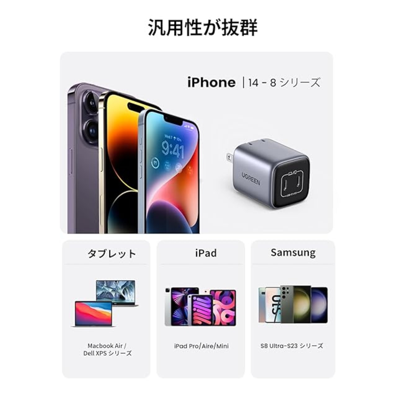 商品名:UGREEN Nexode Mini 45W 充電器 USB-C 2ポート PD&PPS高速チャージ対応 GaNFastII(窒化ガリウム)採用 超小型 折畳式プラグ PD/PPS/QC4+/SCP規格対応/PSE技術基準適合 タイプc 充電器 iphone17-8シリーズ/GalaxyS24-S8シリーズ/MacBook Pro/iPad Pro/Switch その他 各種機器対応 CD294