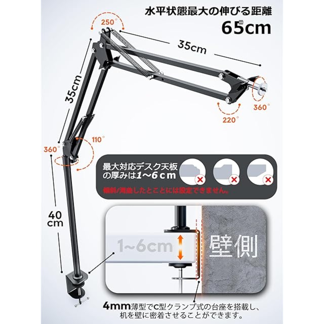 【360°角度自由調整・長く高くなる改良型】 左右上下にかなり柔軟に角度調整することができるスマホ・カメラ両用のアーム式スタンドです。 カメラスタンドが360度自由に回転する構造なので、机の端の方に設置して俯瞰・正対・手元ような形で撮影ができるし、使用しない時は折りたたんでおくことが可能になります。 40cmのアルミ制延長支柱が付属し、高さが調節できる空間が倍増し、真上からの俯瞰撮影は大変便利です。
