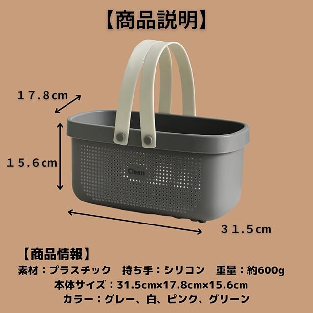 【商品情報】素材:プラスチック 持ち手:シリコン 重量:約300g 本体サイズ:31.5cm×17.8cm×15.6cm カラー:グレー、白、ピンク、グリーン