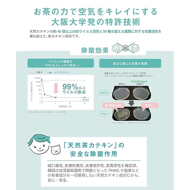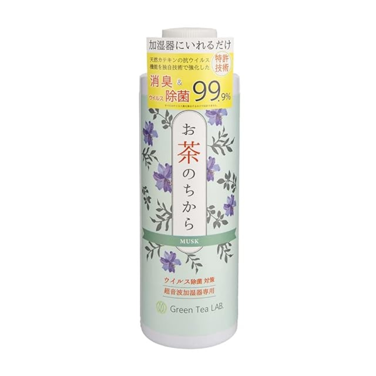 【商品について】<br/> 「加湿器にキャップ1杯」で人気の『お茶のちから』にフレグランスシリーズが新登場。<br/> 加湿器に入れるだけでいい香りと共に、特許技術の除菌効果を発揮してくれます。(菌・ウイルス99.9%除去)<br/> お茶由来の成分なので、お子様やペットのいるご家庭でも安心。<br/> 気分によって選べる4種類の香りです。<br/> 「カテプロテクト」の技術で天然カテキンの約40倍以上の抗インフルエンザ活性と30種を超える菌類に対する抗菌効果があります。<br/> ※「カテプロテクト」は大阪大学産業科学研究所との共同研究で開発された天然カテキン由来の抗菌・抗ウイルス技術です。<br/>お茶由来のテクノロジーによりウイルスや細菌からあなたを守ります。<br/>特許第5279054号 / 特許第5579449号<br/> 成分:カテプロテクト・精製水・DPG・クエン酸塩・グリチルリチン酸ジカリウム・香料<br/> 規格<br/> サイズ:(約)4.5×4.5×15cm<br/>容量:200ml<br/> 生産国:日本<br/> ご使用にあたっての注意事項<br/>・ご使用上の注意を必ずお読みいただき、正しくお使いください。<br/> ・閲覧環境によっては色の出方が異なる場合がございます。<br/>・加湿器1Lあたり、5ml(キャップ1杯)が目安です。<br/> ・加湿器のミストでカテプロテクトを噴霧するため必ず超音波加湿器でご使用ください。<br/> ・超音波加湿器専用です。