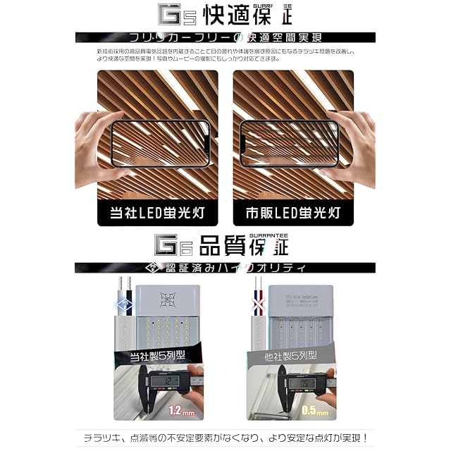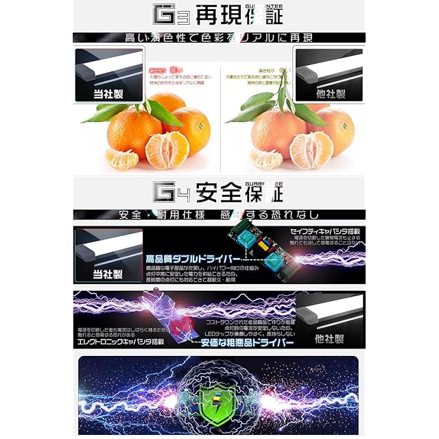 【5列発光・明るさ30%アップ】チップ数が他社製品の約2倍に増えたため、輝度も次第に大幅アップ! 【低温チップ+放熱デザイン】低温チップにアルミカバーのダブル放熱対策でLEDチップの光滅衰を抑え、長時間でも効率よく発光できる。 【高品質ダブルドライバー】高品質な電子部品が充実し、安定した出力で、故障率を最大限に抑え、寿命を延ばする。 【長方形・乳白色ポリカーカバー】目にも優しいし、より自然な雰囲気が作られる。 【簡単取付】電源につなぐ接続線の位置を蛍光灯背部から頭部側面に移動!蛍光灯背部に無駄な空間を作らない、接続線をそのまま電源とつなげばいい!