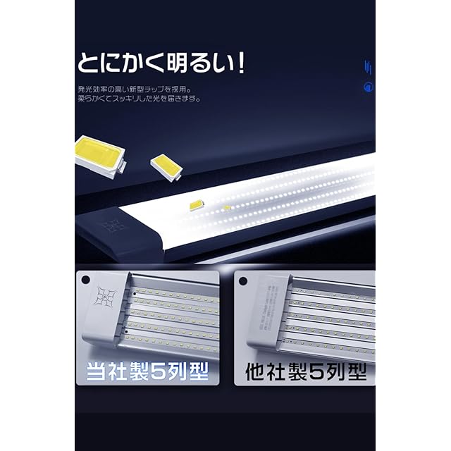 【5列発光・明るさ30%アップ】チップ数が他社製品の約2倍に増えたため、輝度も次第に大幅アップ!【低温チップ+放熱デザイン】低温チップにアルミカバーのダブル放熱対策でLEDチップの光滅衰を抑え、長時間でも効率よく発光できる。