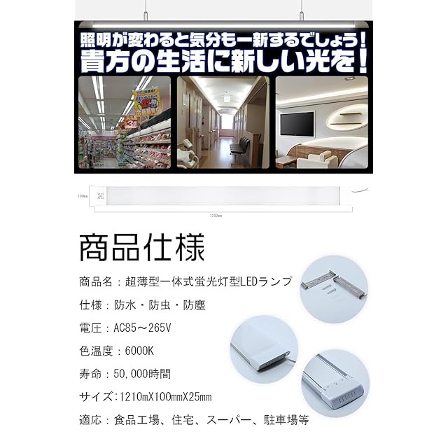 ★商品名:超薄型一体式蛍光灯型LEDランプ◆消費電力:50W(100W相当) ◆発光色:昼光色(6000K)◆電圧:AC85〜265V◆長寿命:約50000時間◆仕様:防水・防虫・防塵◆サイズ(約):1210X100X25(mm)