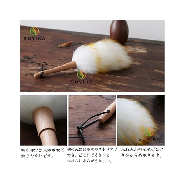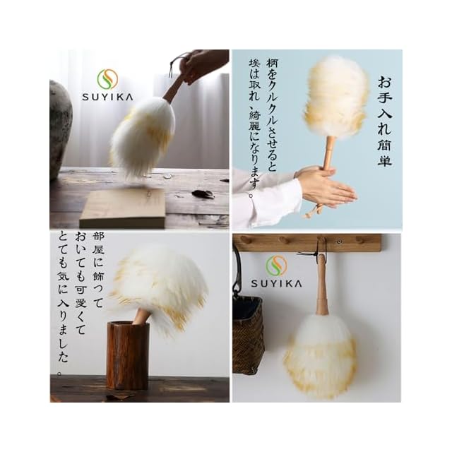 【ふわふわの羊毛製&サッと撫でるだけで簡単】:綿菓子のようなふわふわダスターが羊毛を使用した。ウールがホコリをしっかり吸着、弾力性に優れて、ふわふわの羊毛なので、狭い場所や、細かな物が置かれている場所でもスムーズに入り込んで、ほこりをキャッチ!軽く撫でるだけでキレイにします。(注意:柄の部分にsuyika logo模様を彫った。最近偽者の相乗り出品があるため、ご購入の際は必ず、販売元がsuyikaであることをご確認の上、ご購入お願い申し上げます。)