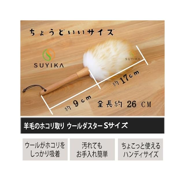 商品名:Suyika ほこり はたき ほこり取り 羊毛 ホコリ取り ふわふわ おしゃれ ウールダスター ホコリとり ほこりとり ハンディモップ 掃除道具 部屋掃除 家庭用 車用 埃払い 埃取り はたき 羊毛ダスター 天然木の柄 Sサイズ約26cm