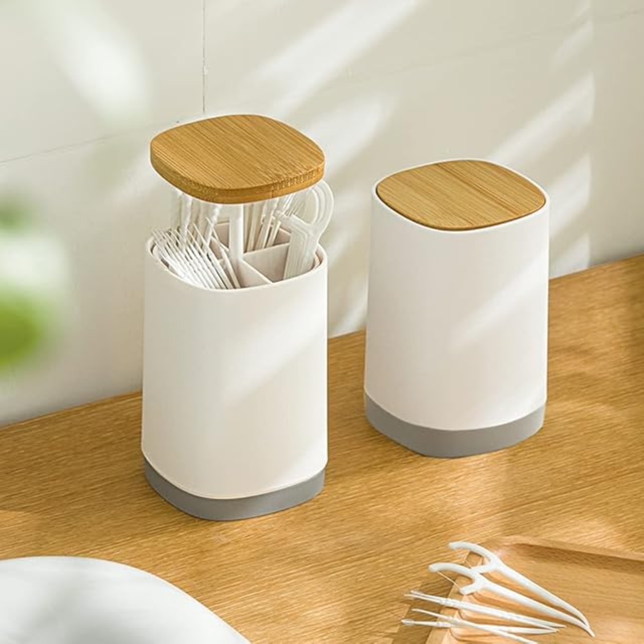 4つ分けの設計:4つの仕切り付き、綿棒や爪楊枝を別々に収納し、取りやすいです。綿棒や爪楊枝などの衛生用品をキレイに収納でき、高級感もあって、サニタリースペースにも違和感なく置いて頂けます。