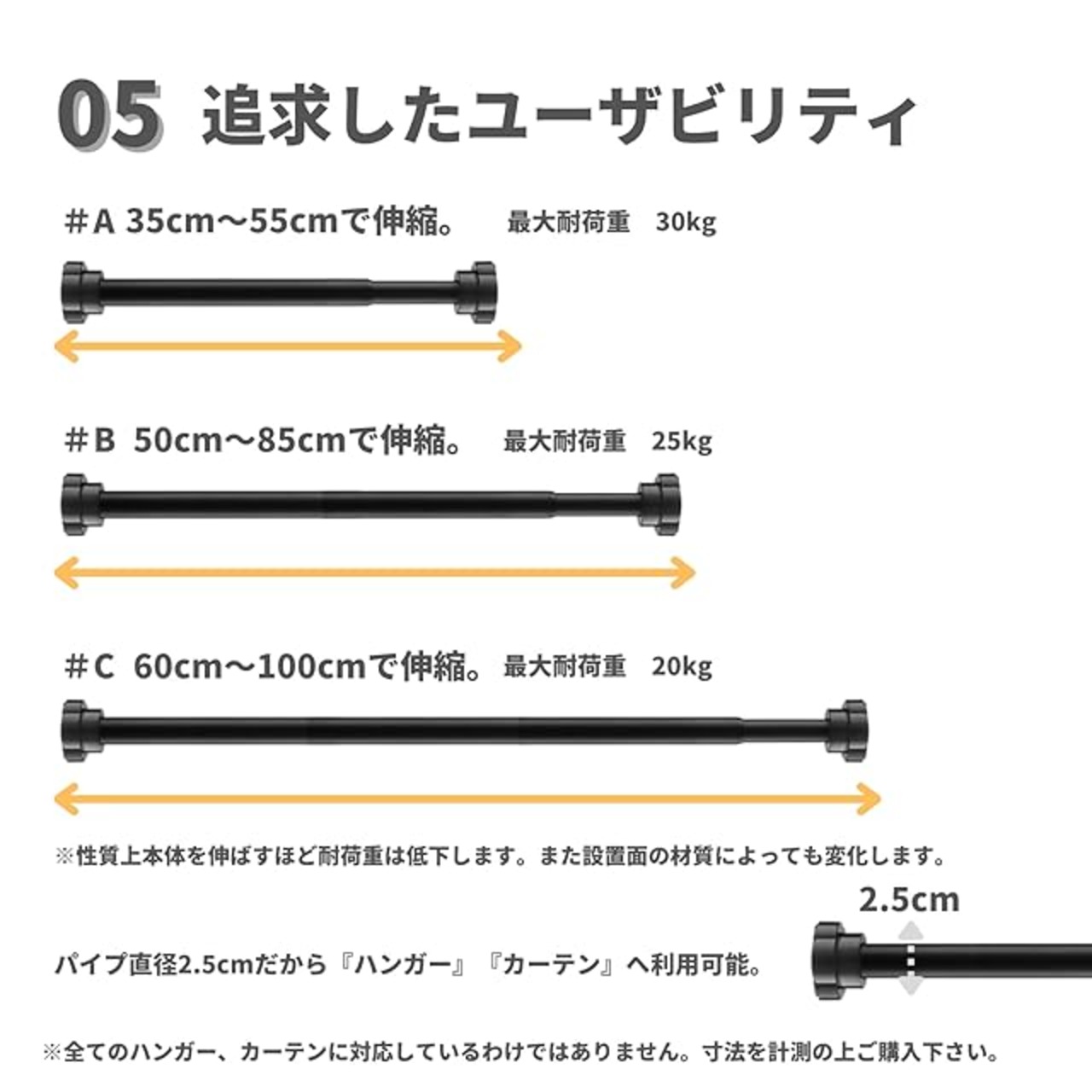 商品名:Own Craft 強力 突っ張り棒 カーテン クローゼット 調整簡単 工具不要 直径25mm 漆黒ブラック (#A 35~55cm)