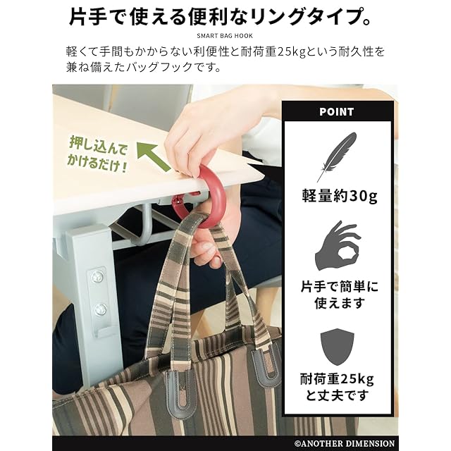 ✅ 【バッグフックで解決!】カバンの持ち手をリングに通してテーブルに押し込むだけ。片手で簡単に使えて、バッグを床に置かずに済みます。 耐荷重は約25kgなので、リュックやビジネスバッグなどでも使えるカバン掛けです。