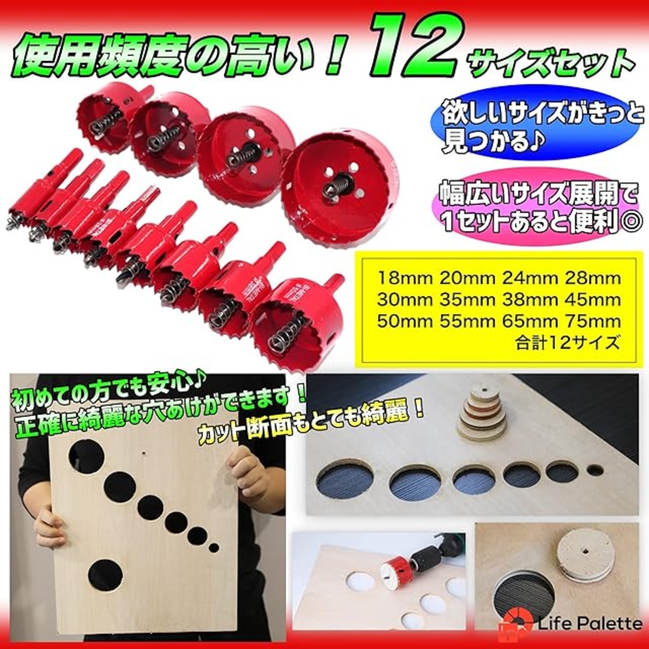 商品名:ライフパレット バイメタル ホールソー ホルソー セット 穴あけ 切削 工具 12本 18mm 20mm 24mm 28mm 30mm 35mm 38mm 45mm 50mm 55mm 65mm 75mm (12)