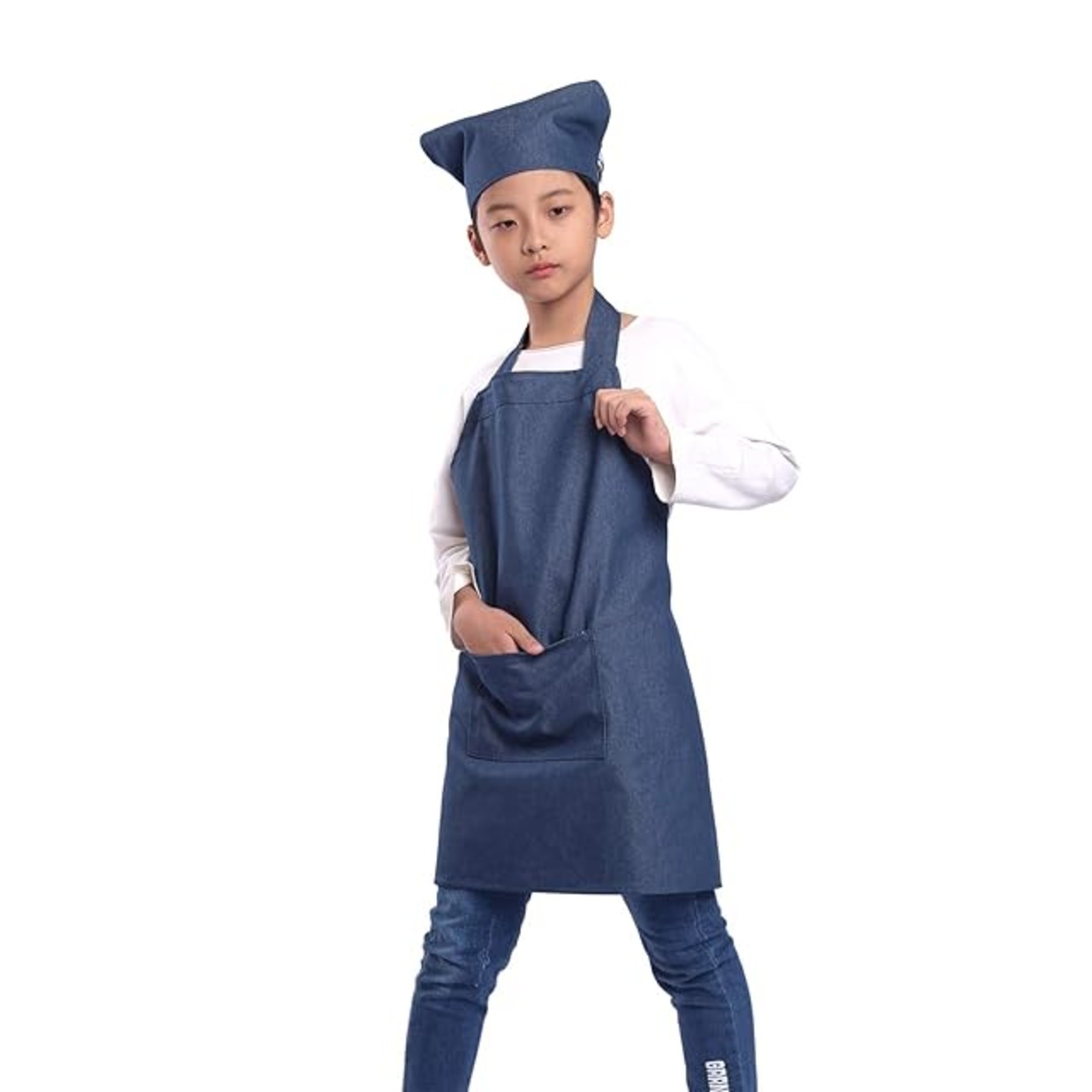 [BIGHAS] キッズ エプロン 3点セット 子供 三角巾 巾着バッグ 無地 男の子 女の子 色落ちしない ホコリが付きにくい (高学年用(140~160cm) L, デニム)