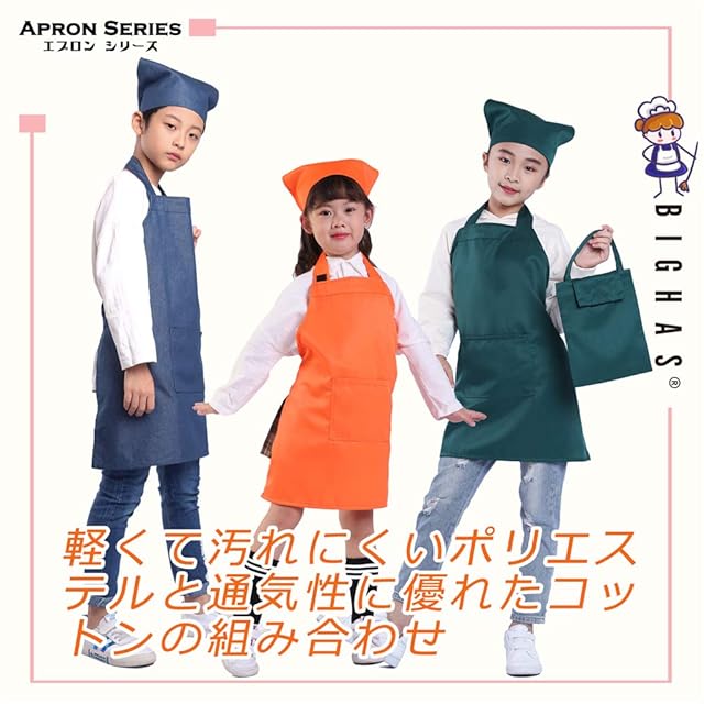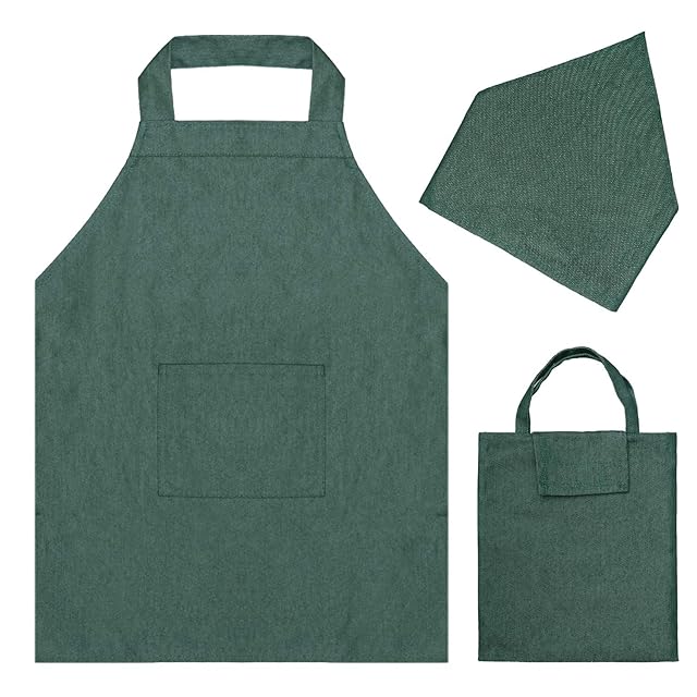 [BIGHAS] キッズ エプロン 3点セット 子供 三角巾 巾着バッグ 無地 男の子 女の子 色落ちしない ホコリが付きにくい (低学年用(120~140cm) M, デニムグリーン)