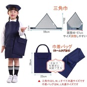 エプロン、三角巾、巾着バッグの3点セットです。エプロンは子供でも着脱やサイズ調整が楽なマジックテープ仕様、三角巾は装着しやすく、ずれにくいゴムタイプになります。
