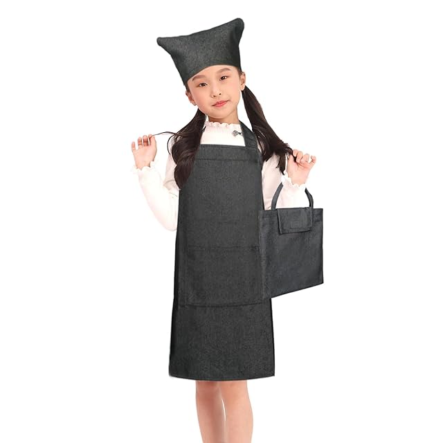 [BIGHAS] キッズ エプロン 3点セット 子供 三角巾 巾着バッグ 無地 男の子 女の子 色落ちしない ホコリが付きにくい (低学年用(120~140cm) M, デニムブラック)