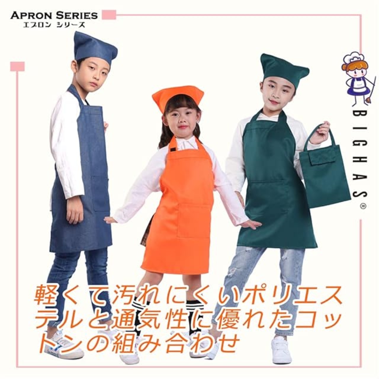 [BIGHAS] キッズ エプロン 3点セット 子供 三角巾 巾着バッグ 無地 男の子 女の子 色落ちしない ホコリが付きにくい (低学年用(120~140cm) M, サファイアブルー)