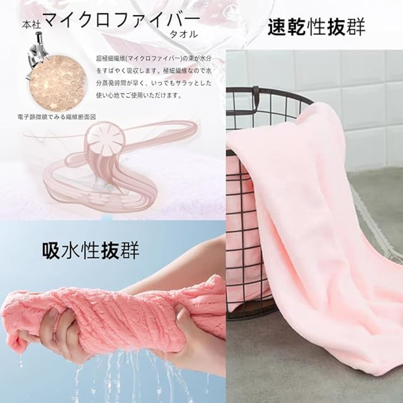 【抜群の吸水性】毛髪の1/100の超極細繊維(マイクロファイバー)の束が毛細血管現象で水分をすばやく吸収、拡散します。吸水した後も方面席が広い極細繊維なので水分蒸発時間が早く、いつでもサラッとした使い心地です。