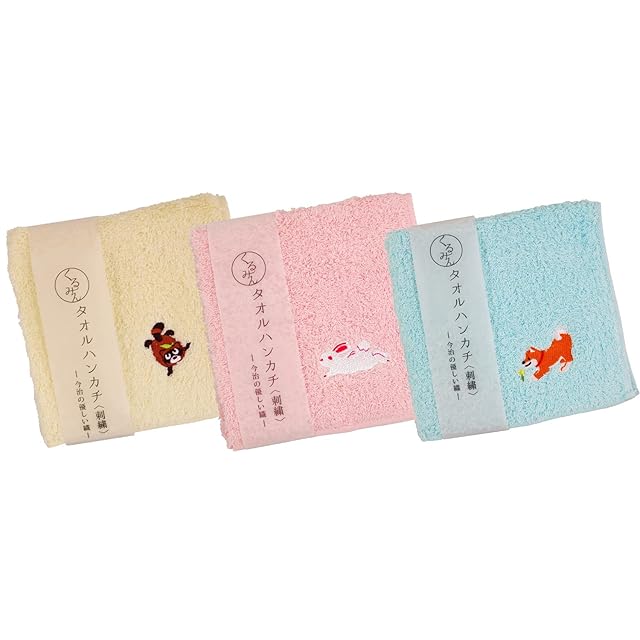 京佑 日本製 今治 刺繍 ハンカチ 3枚セット 約25cm×25cm ハンド タオル ウォッシュ ミニ 綿 くるみん 動物A
