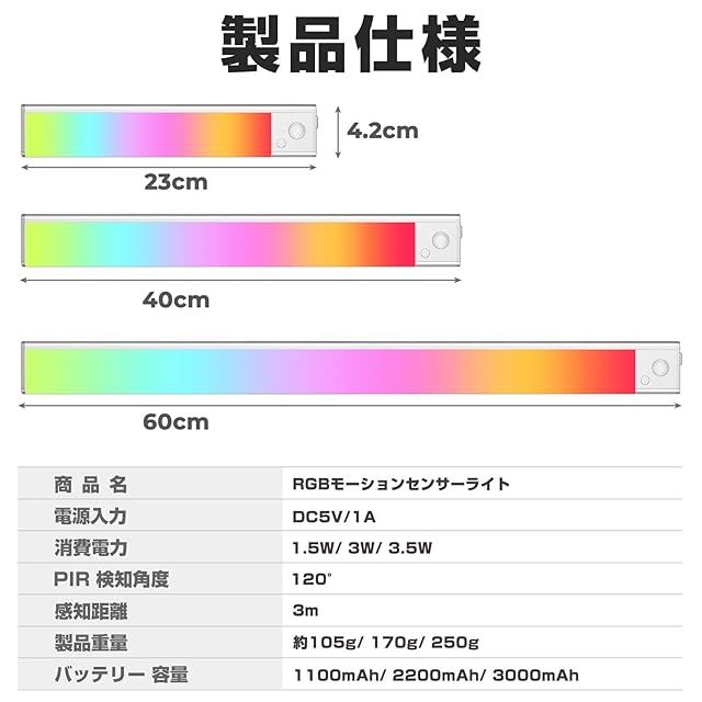 商品名:人感センサーライト LEDセンサーライト 40cm バーライト カラフル&昼白色 無段階調光 Type-C 充電式ライト 階段ライト 120° 3M誘導距離 屋内 マグネット 配線工事不要 超薄型設計 省エネ 高感度 間接照明 寝室 廊下 階段 玄関 長寿命