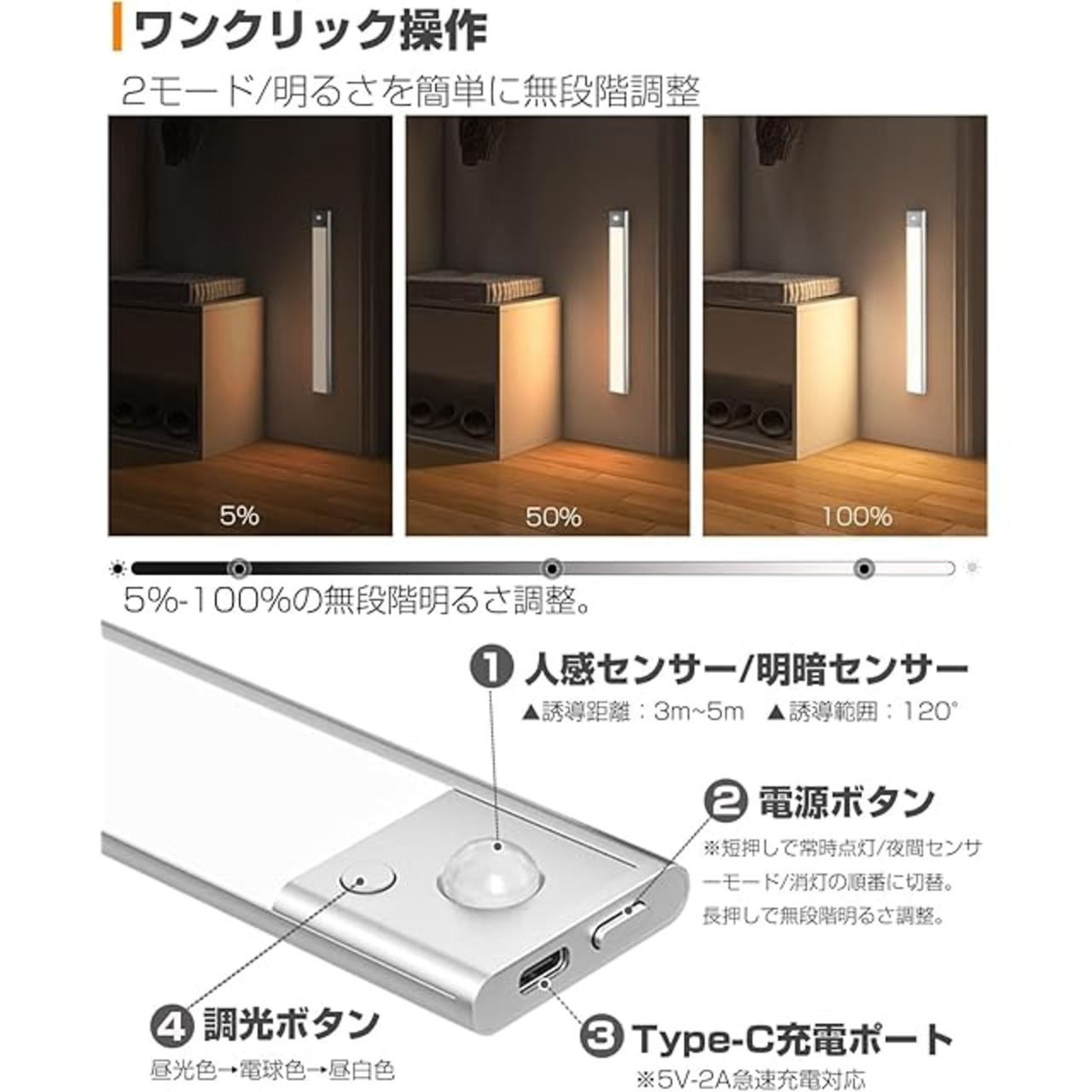 無段階調光・3段階調色・超薄型設計・記憶機能】LEDセンサーライトとして周りの人に迷惑をかけたりしない10%~100%の無段階調光(点灯中に電源ボタンを長押し)が可能となり、また発光面にある調色ボタンを押す度に3段階の色温度(昼光色/昼白色/電球色)も調整することが出来ます。扱いやすい超薄型設計の為、どの場所でも簡単に取付できます。またライトの記憶機能も搭載しており、再度点灯時は前回点灯状態の明るさで点灯してくれます。