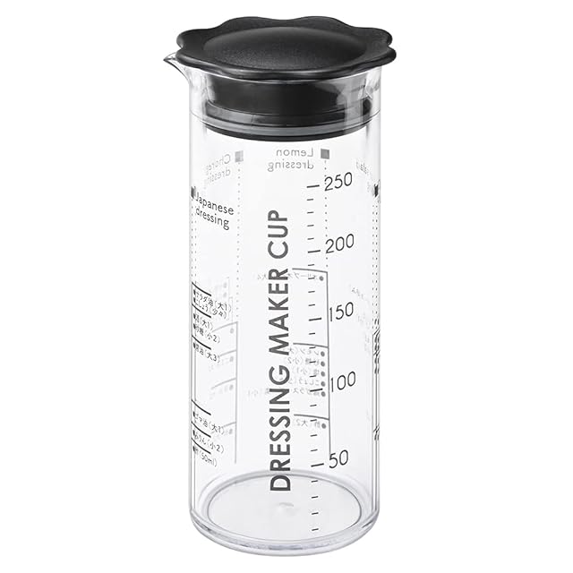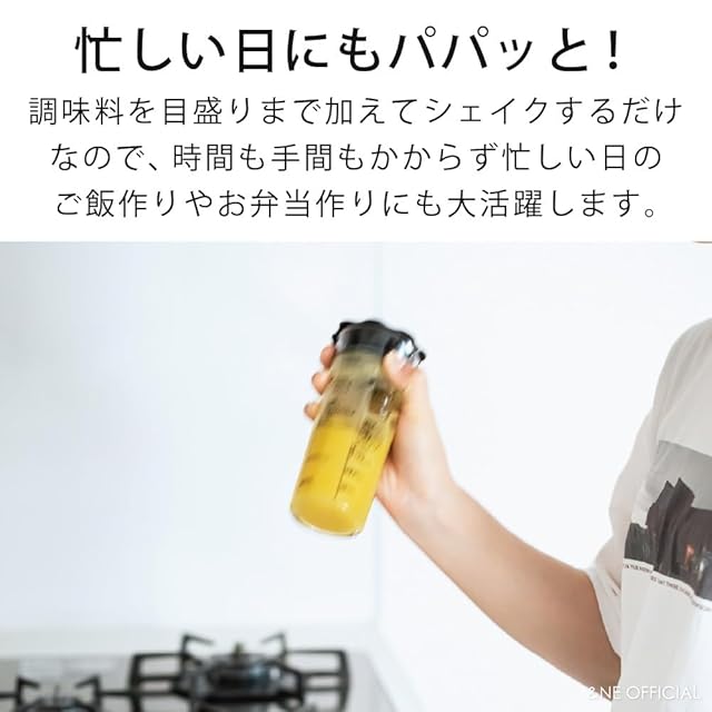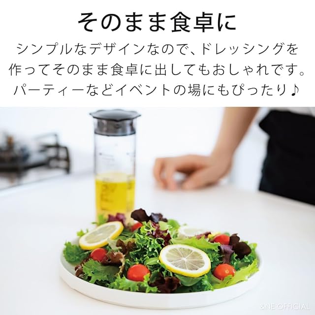 目盛りに合わせて調味料を下から順に加えるだけで、誰でも簡単にドレッシングを作ることができます。