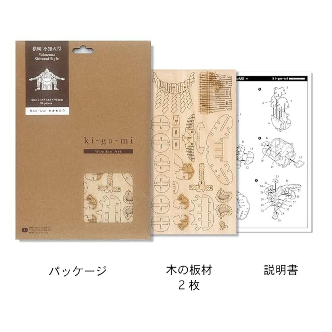 <b>「作る」「飾る」「使う」</b></br><b>木製立体パズル ki-gu-mi ( キグミ ) シリーズ</b></br><br></br>ki-gu-miの特徴</br><ol><li>環境に優しい木製</li><li>道具不要で手軽に組立</li><li>場所を取らないシンプルなパッケージはギフトにも最適</li></ol><p>横綱土俵入りの型のひとつです。 1回目で四股を踏んだ後、せり上がりの時に両手を伸ばすのが不知火型です。