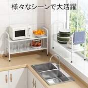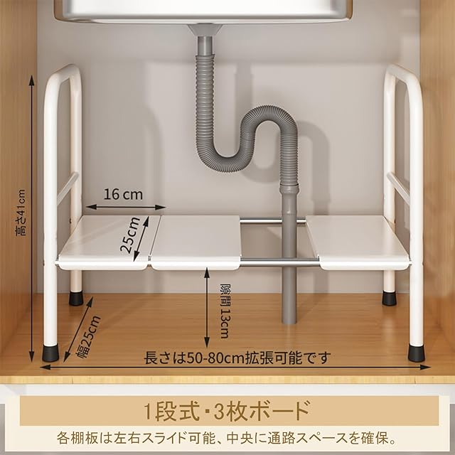 【シンク下 収納ラック 基本仕様】プラスチック製で耐久性あり、可動板計 3枚を装備;サイズ:幅 50-80cm× 奥行 25cm× 高さ 41cm(高さ 5cm 調整可能);重量約 1.3kg、耐荷重 20kg;シンク下や洗面台下の収納に最適で、スペースを大幅節約できます。