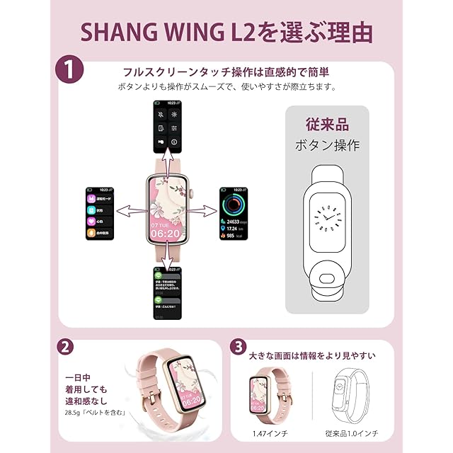 商品名:SHANG WING スマートウォッチ レディース iphone対応 アンドロイド対応 リストバンド型 腕時計 1.47インチ大画面 フルタッチ Smart Watch 着信通知 女子生理サイクル記録 多種類運動モード 天気予報 IP68防水 文字盤自由設定 誕生日 クリストマス 新年 ギフト 日本語説明書付き Lynn2 ピンク