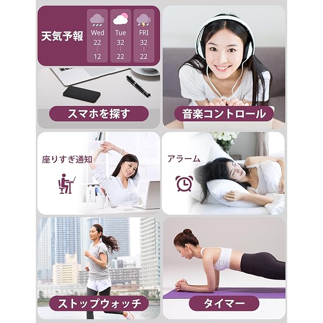 「100+文字盤·座りすぎ通知·生理周期」スマートウォッチ本体に5つの文字盤を搭載。専用アプリで100以上の文字盤をダウンロードできるだけでなく、アルバムや撮影により、お気に入りの写真を文字盤に設定することもでき、毎日気分に合わせたスタイルを楽しめます!専用アプリで座り過ぎのリマインダーの時間帯や間隔を自由に設定し、日常生活に無理なく取り入れられます。体を動かすタイミングを見逃しません。さらに、女性の生理周期を記録する機能では、アプリで生理周期の開始日と終了日を記録することで、次回の予想月経日や排卵日などを予測することができます。