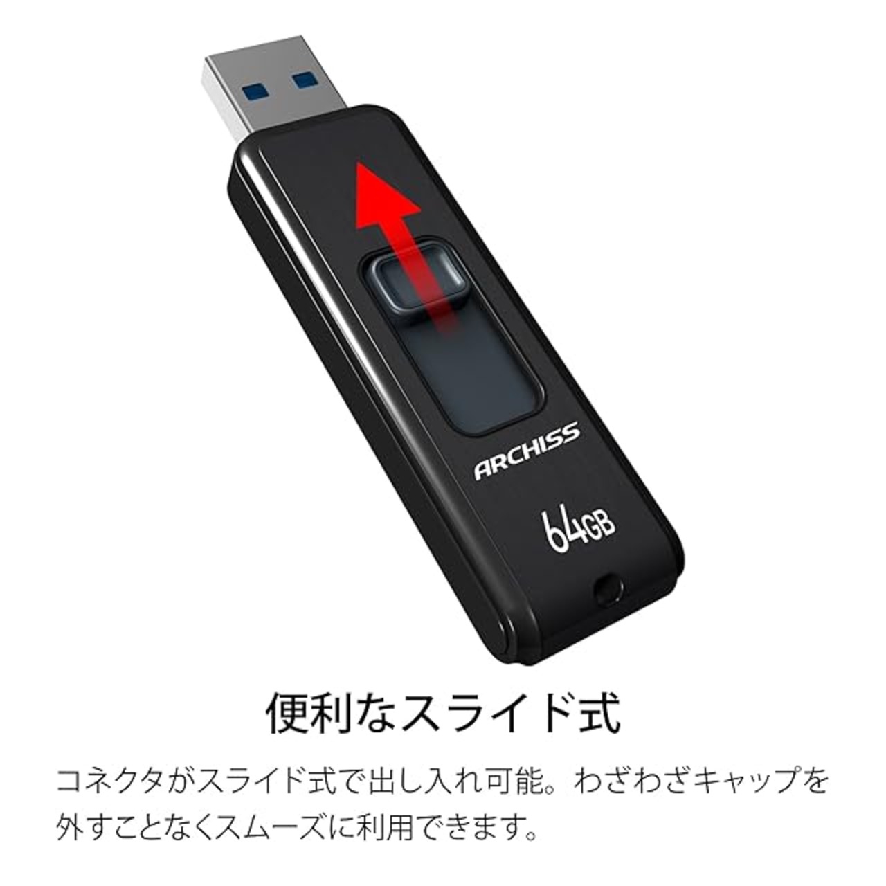 商品名:アーキス(Archiss) USBメモリ 64GB USB3.2(Gen1) / USB3.1(Gen.1) / USB3.0 / USB2.0 対応 スライド式 ストラップホール付き キャップレスデザイン AS-064GU3-PSB