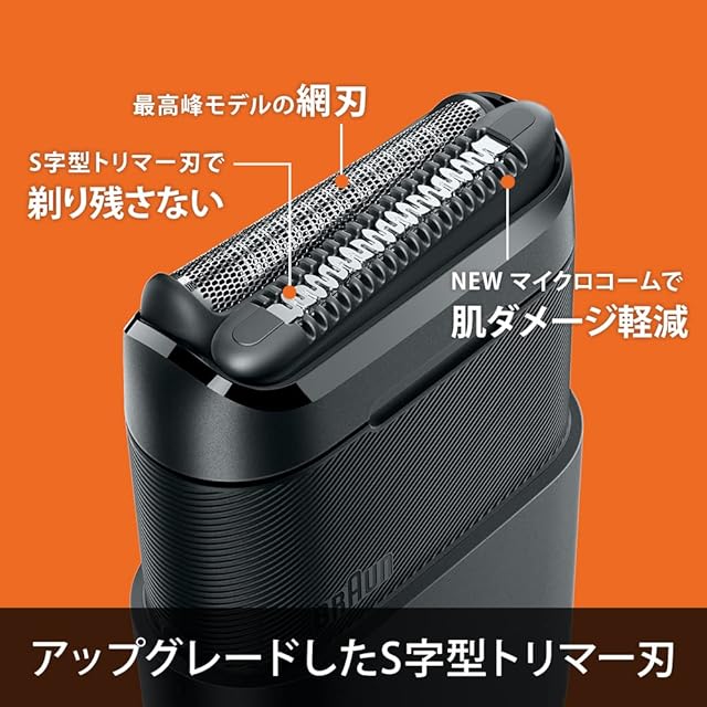 浮き沈みする2枚刃が肌に密着。最高峰モデルの網刃を搭載しヒゲをしっかりキャッチ。S字型トリマー刃で剃り残さない。