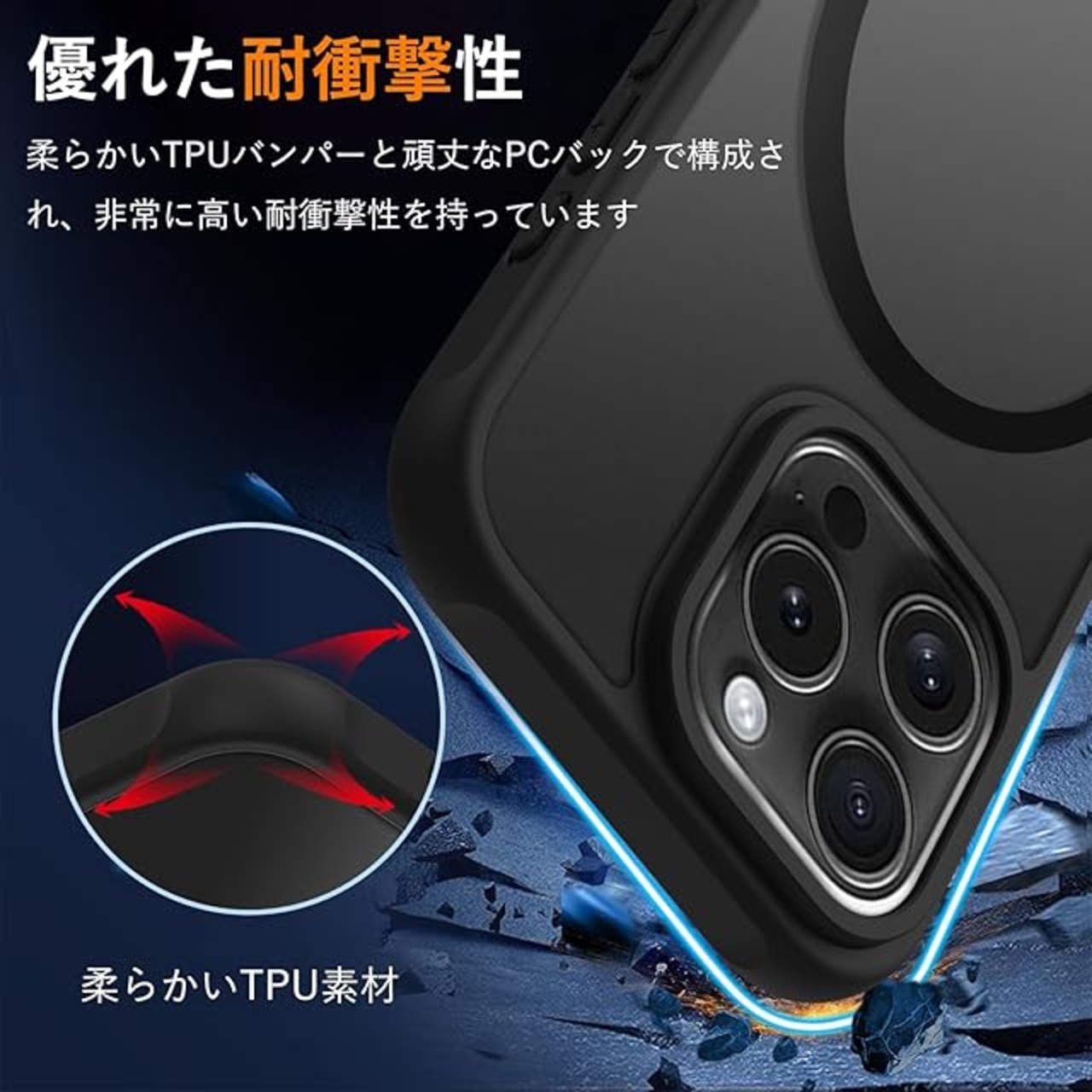 【米軍MIL規格・高耐衝撃性】このスマホケースは、世界的に有名な米国軍事規格を取得しており、高弾性の衝撃吸収バンパーと頑丈なポリカーボネート素材を組み合わせた設計で、優れたバランスを実現しています。優れた耐衝撃性能を備え、あらゆる方向からあなたのスマホをしっかりと保護します。