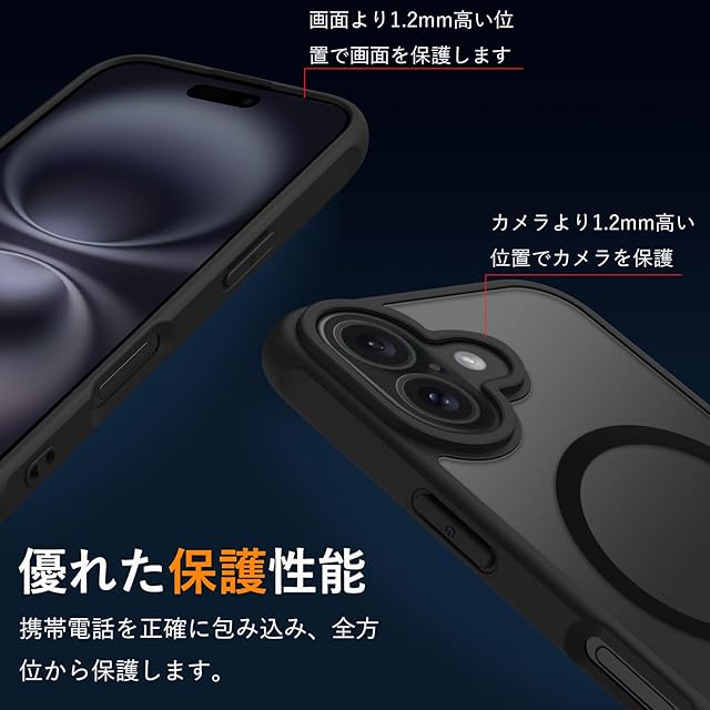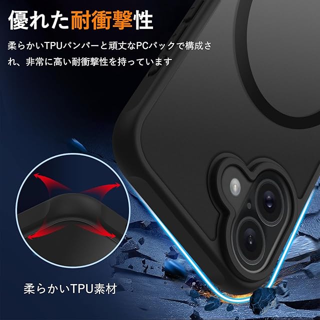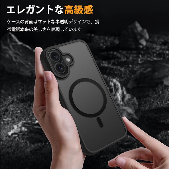 商品名:iPhone 16 ケース MagSafe対応 耐衝撃 半透明 マグネット搭載 軽量 薄型 マグセーフ マット感 黄ばみなし 米軍MIL規格 ストラップホール付き ワイヤレス充電対応 EUMADOVE (ブラック, IPhone 16)