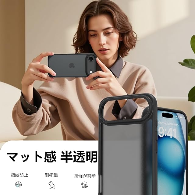 【半透明マットのモダン美学】 背面は半透明のマット仕上げを採用。iPhone Airの背面ロゴがほのかに透けて見え、上品でモダンな雰囲気を醸し出します。また、耐黄変加工を施しているため、長期間使用しても変色や劣化が起こりにくく、美しい見た目を維持します。シンプルながらも奥行きのあるデザインは、あらゆるシーンであなたのスマートなスタイルを引き立てます。