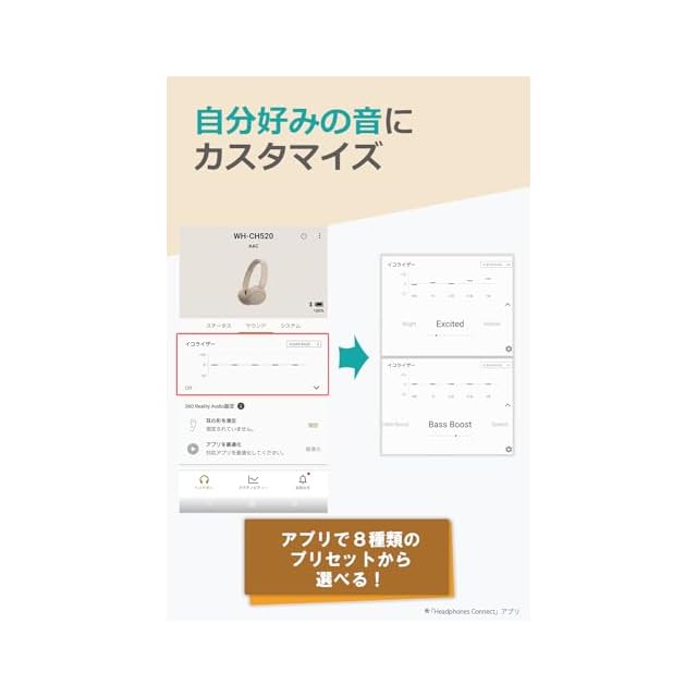 専用アプリ「Headphones Connect」に対応しており、お好みの音質にカスタマイズする事ができる「イコライザー」を使うことで「Relaxed」や「Bass Boost」など8種類のプリセットから選択したり、お好みのイコライザー設定にカスタマイズしたりすることが可能です。
