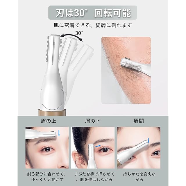 【革新的技術30°回転設計・デュアルサイズ刃】 眉毛シェーバー メンズの最新技術のヘッド部が30°回転する設計のため、肌に密着し、細かい部分もきれいに剃ることができます。 通常眉毛カッターの幅広刃に加え、眉毛を整える際に細かい形状を作るための小型刃を追加しました。 フェイスシェーバー レディース 2mm/4mmのロング/ショートコームが付属しており、簡単に形を整え、長さを調節して理想の眉に仕上げることができ、初心者でも簡単に使うことができます電気シェーバー 女性。