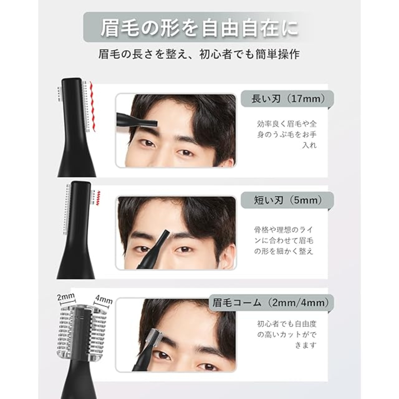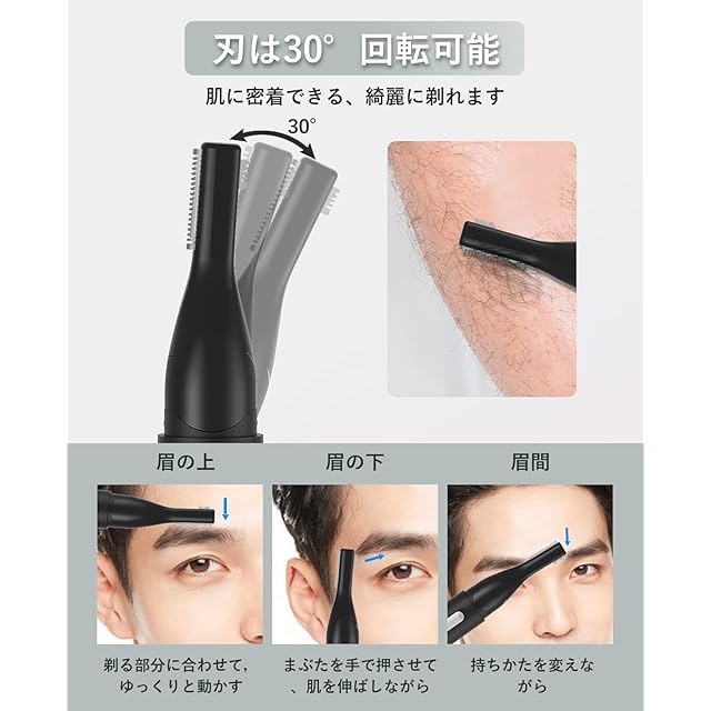 【革新的技術30°回転設計・デュアルサイズ刃】 眉毛シェーバー メンズの最新技術のヘッド部が30°回転する設計のため、肌に密着し、細かい部分もきれいに剃ることができます。 通常眉毛カッターの幅広刃に加え、眉毛を整える際に細かい形状を作るための小型刃を追加しました。 フェイスシェーバー レディース 2mm/4mmのロング/ショートコームが付属しており、簡単に形を整え、長さを調節して理想の眉に仕上げることができ、初心者でも簡単に使うことができます電気シェーバー 女性。